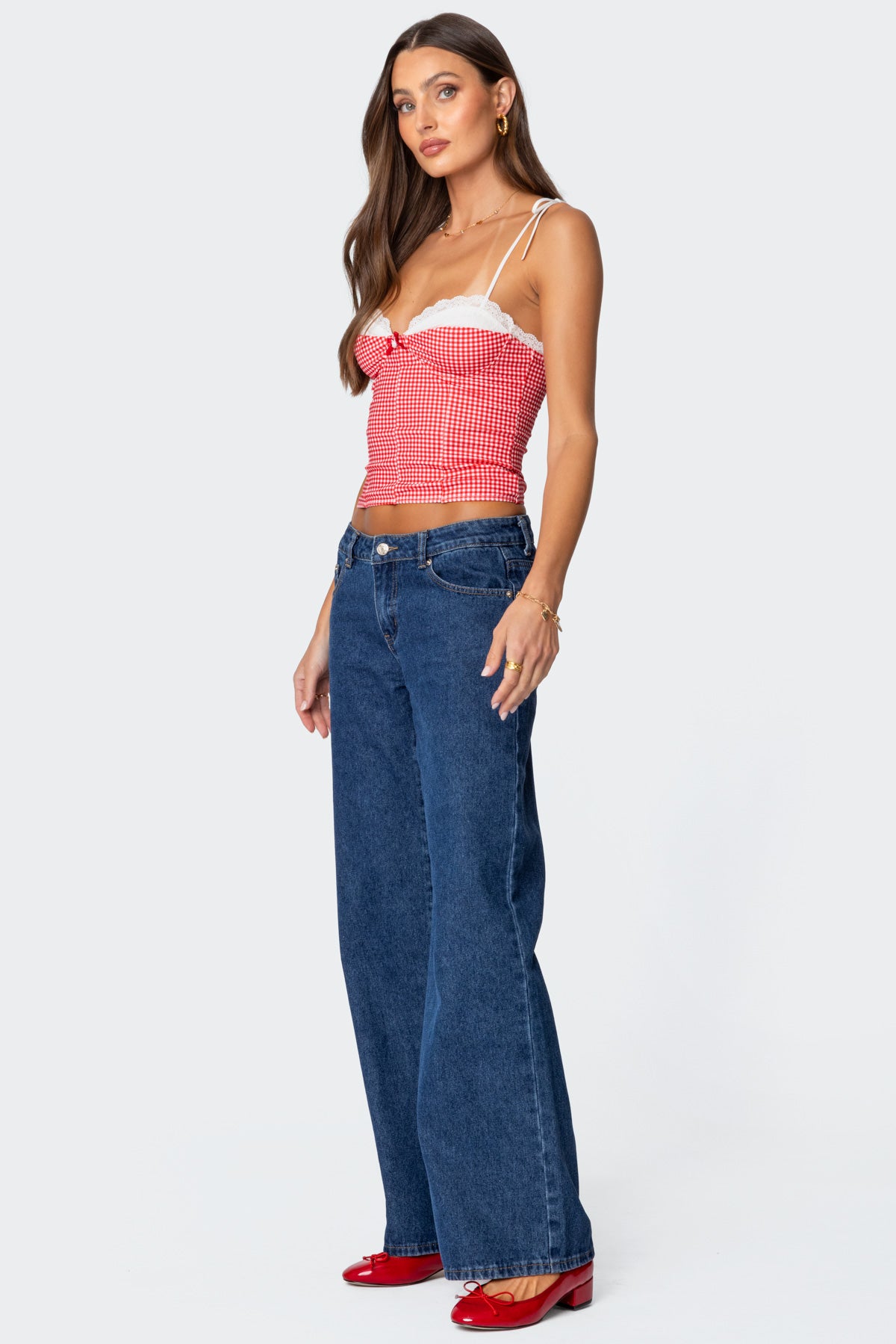- Exposed lace bra detail